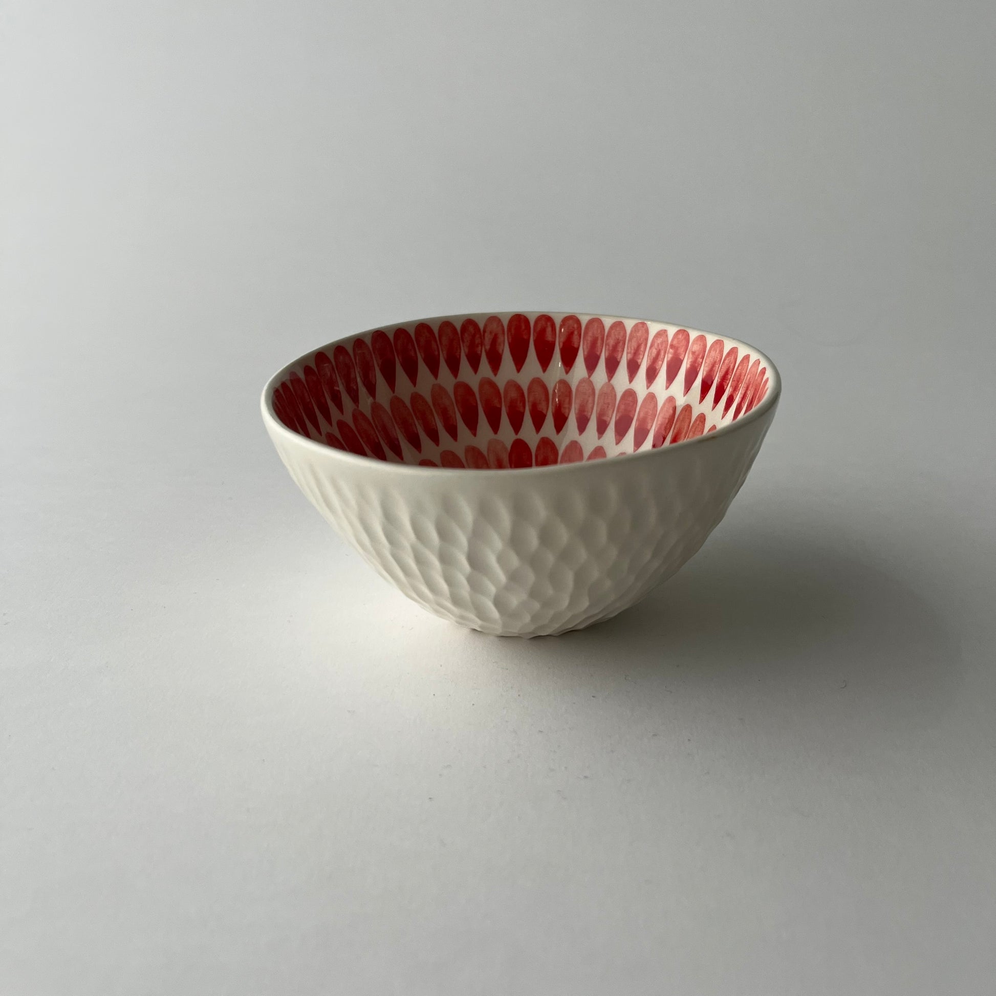 Handmade bowl crafted from white clay and decorated with underglaze pigments. The carved surface gives the bowl a lightness that makes it pleasant to hold. This bowl enlivens interiors and adds a playful touch. It can be used for food preparation, dining, or table serving.