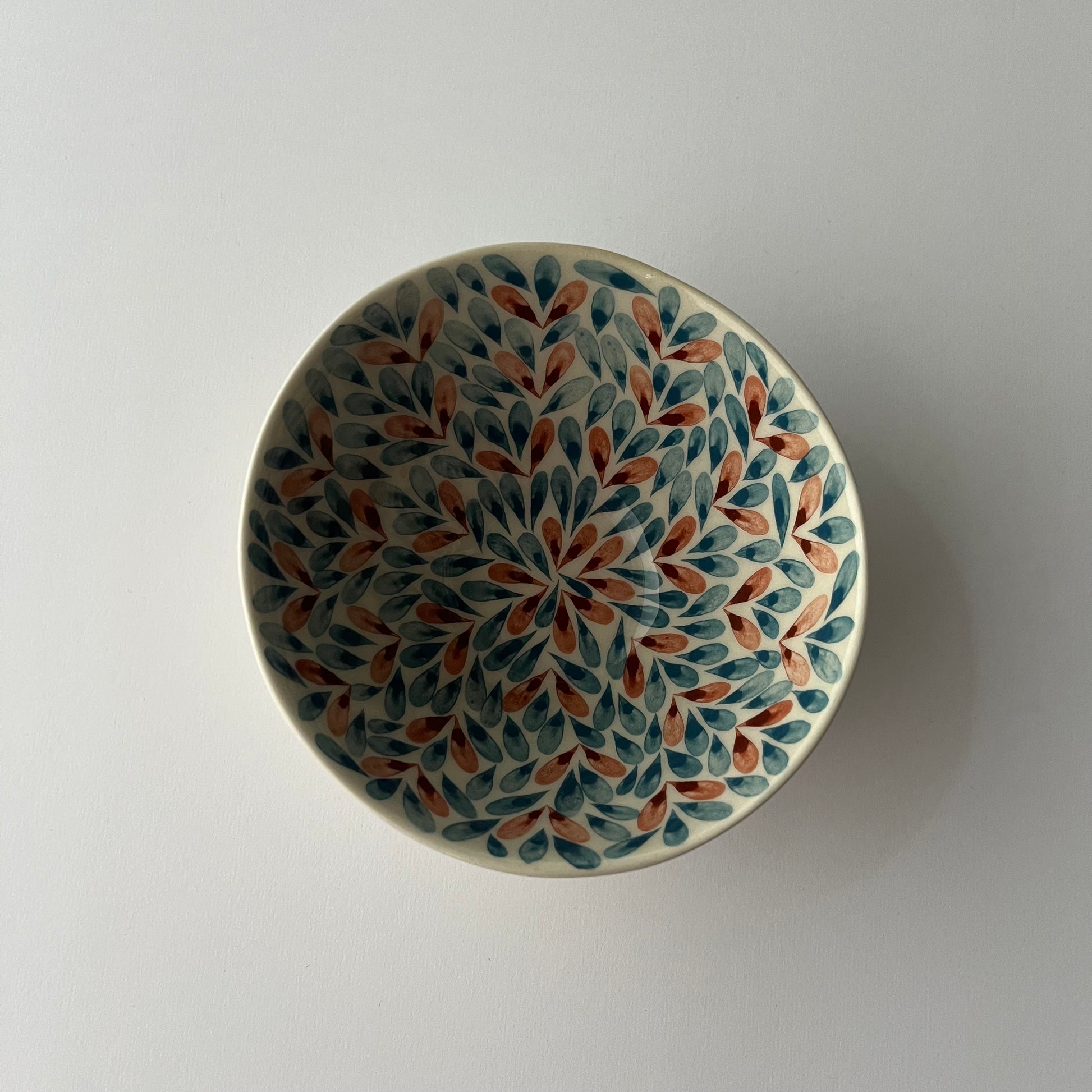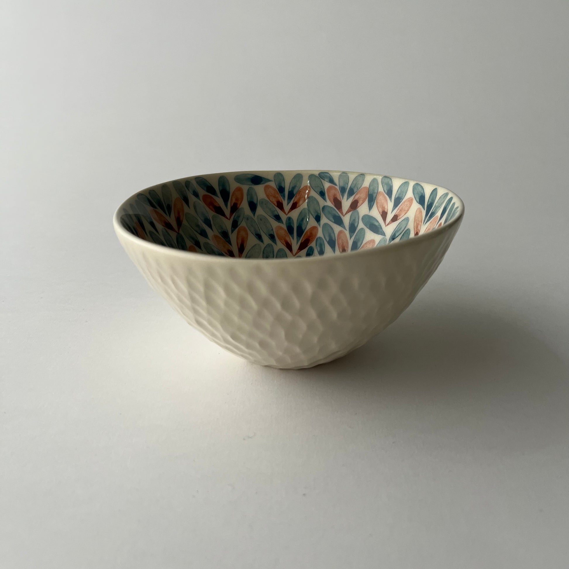 Handmade bowl crafted from white clay and decorated with underglaze pigments. The carved surface gives the bowl a lightness that makes it pleasant to hold. This bowl enlivens interiors and adds a playful touch. It can be used for food preparation, dining, or table serving.