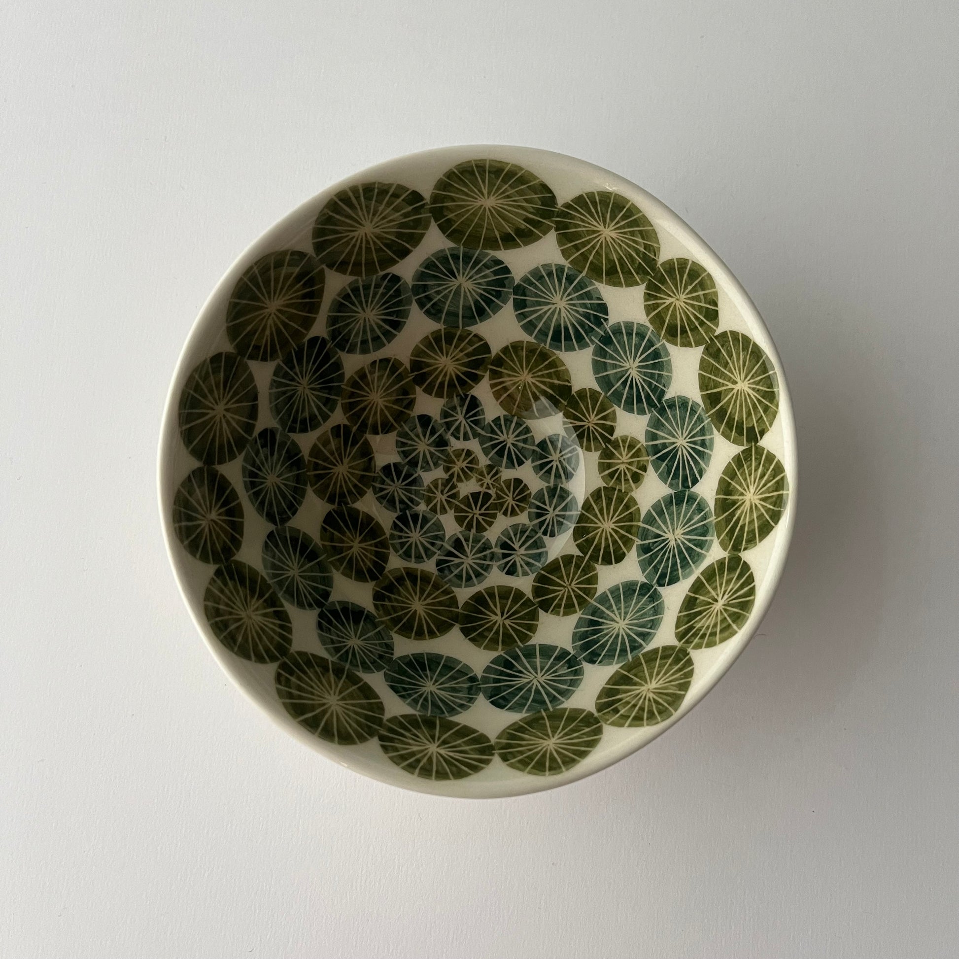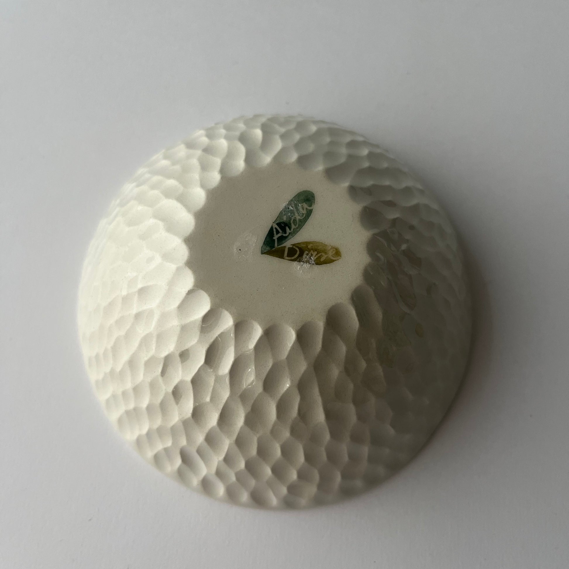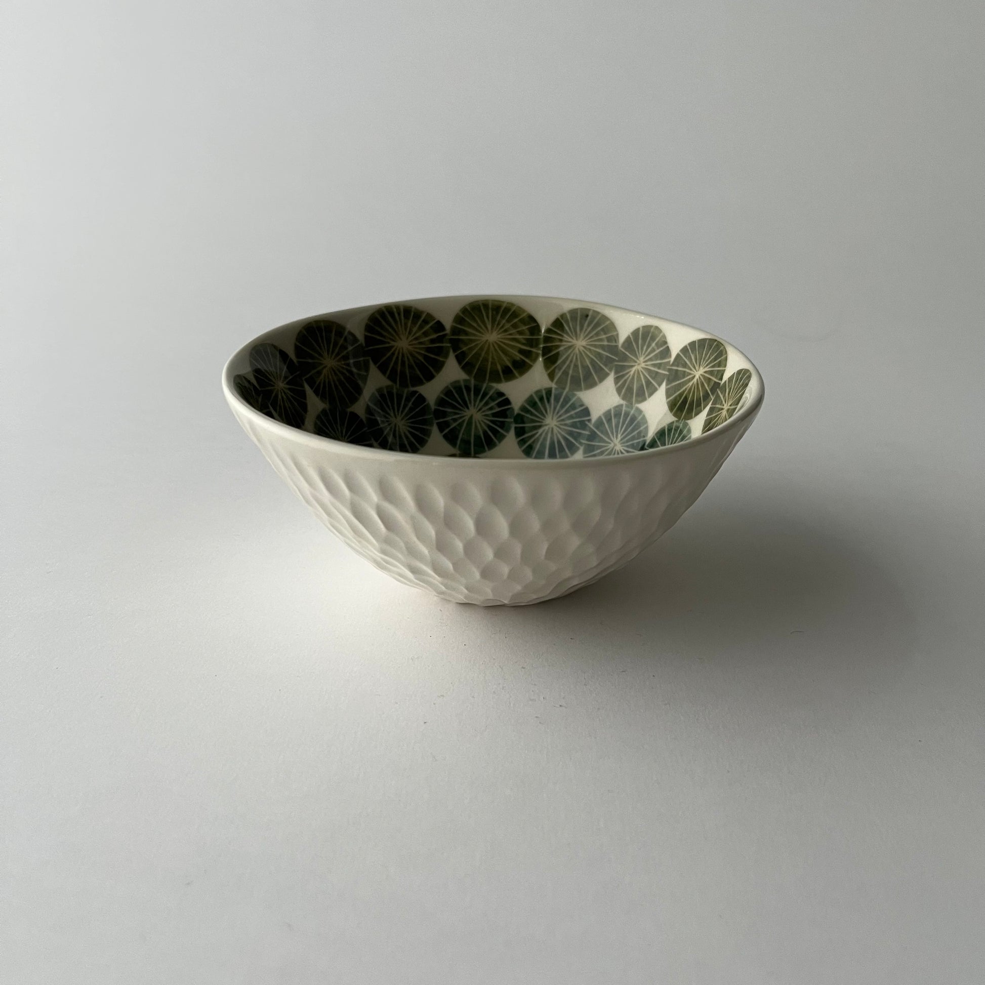 Handmade bowl crafted from white clay and decorated with underglaze pigments. The carved surface gives the bowl a lightness that makes it pleasant to hold. This bowl enlivens interiors and adds a playful touch. It can be used for food preparation, dining, or table serving.