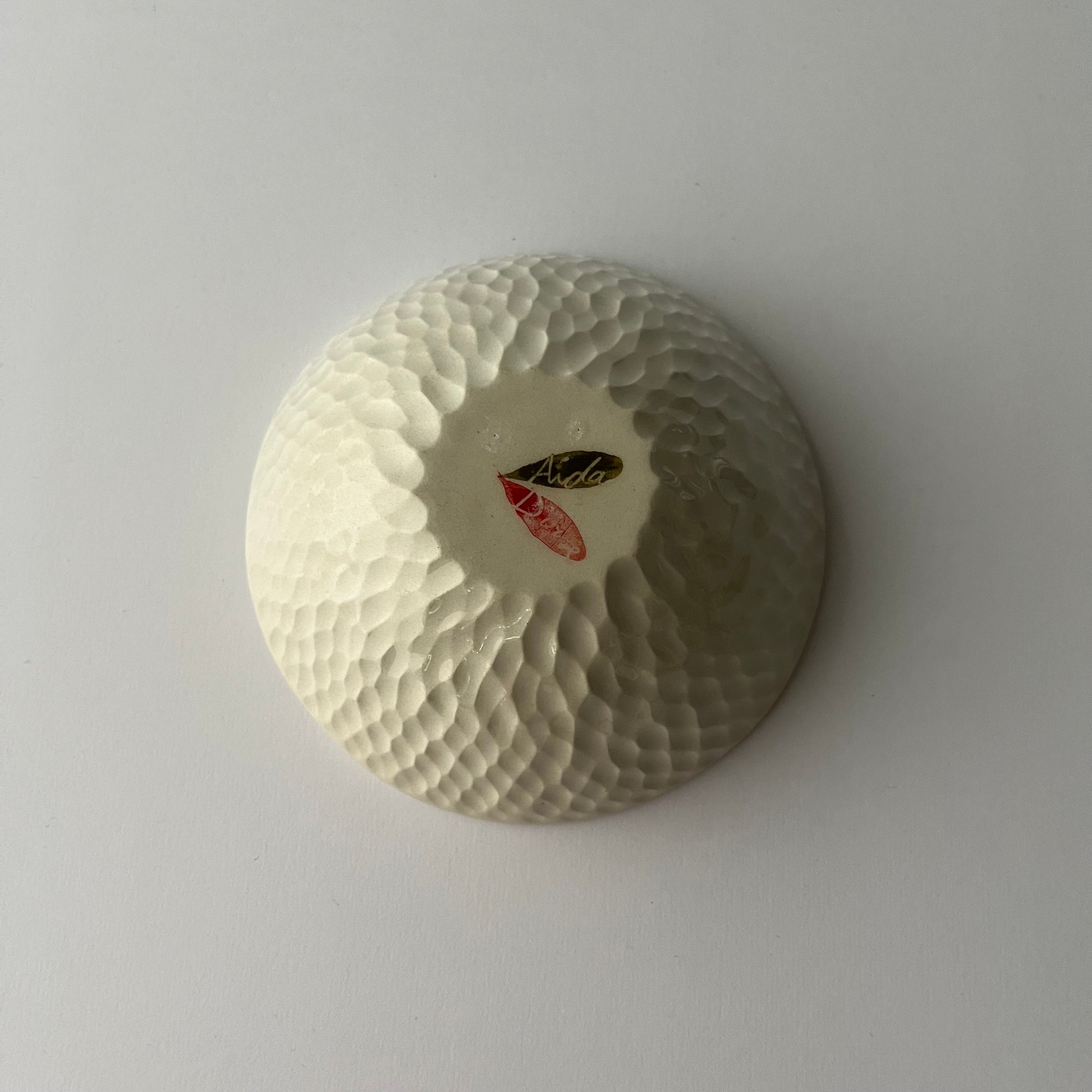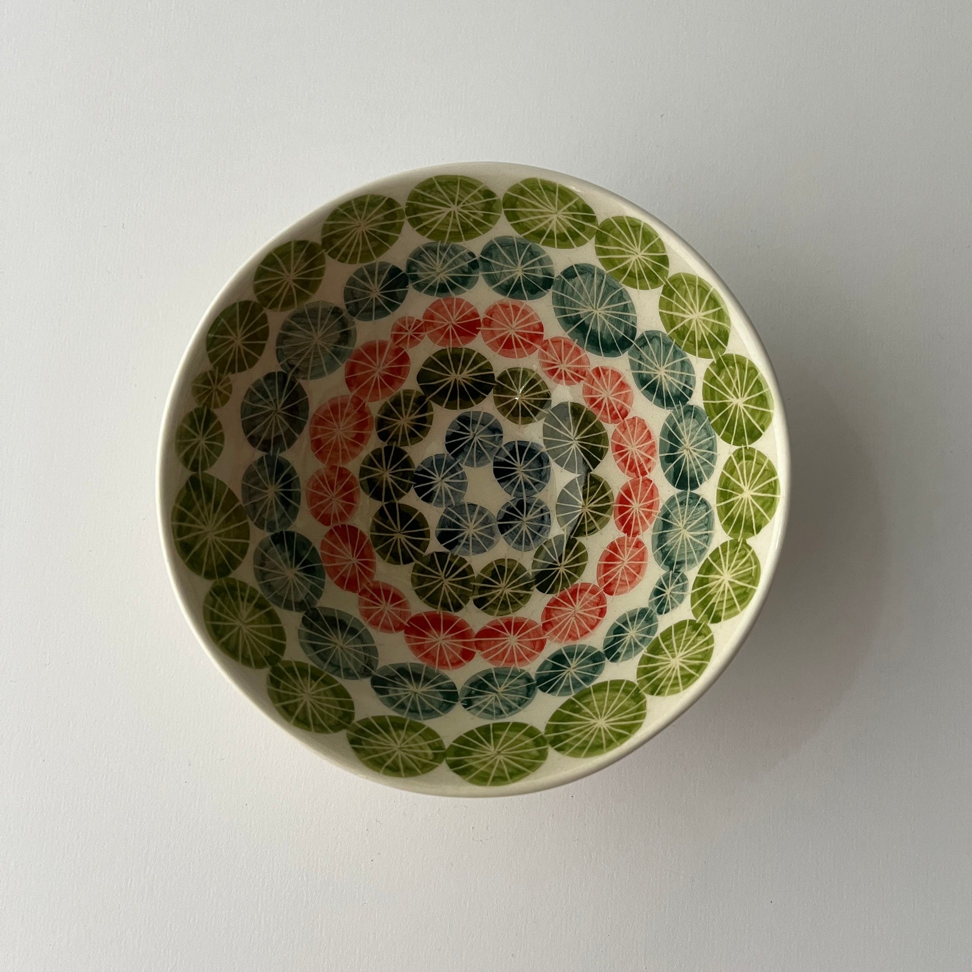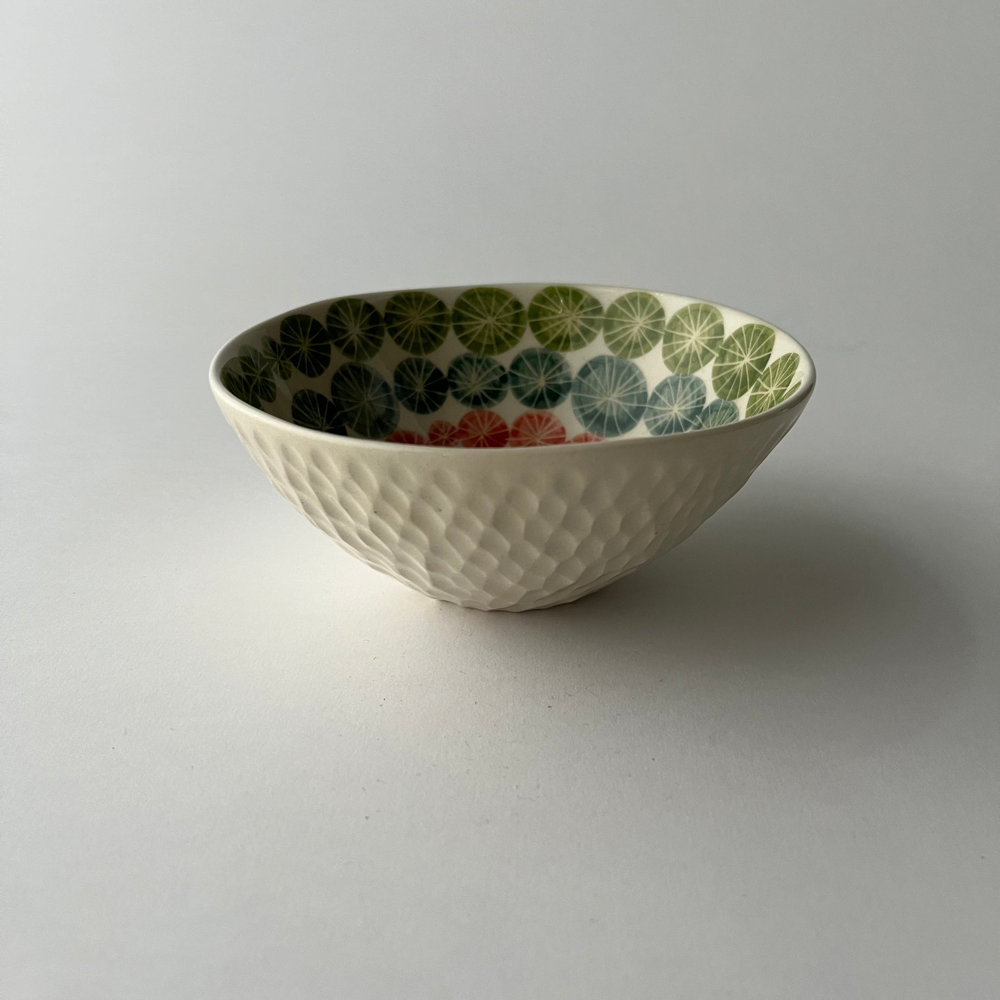 Handmade bowl crafted from white clay and decorated with underglaze pigments. The carved surface gives the bowl a lightness that makes it pleasant to hold. This bowl enlivens interiors and adds a playful touch. It can be used for food preparation, dining, or table serving.