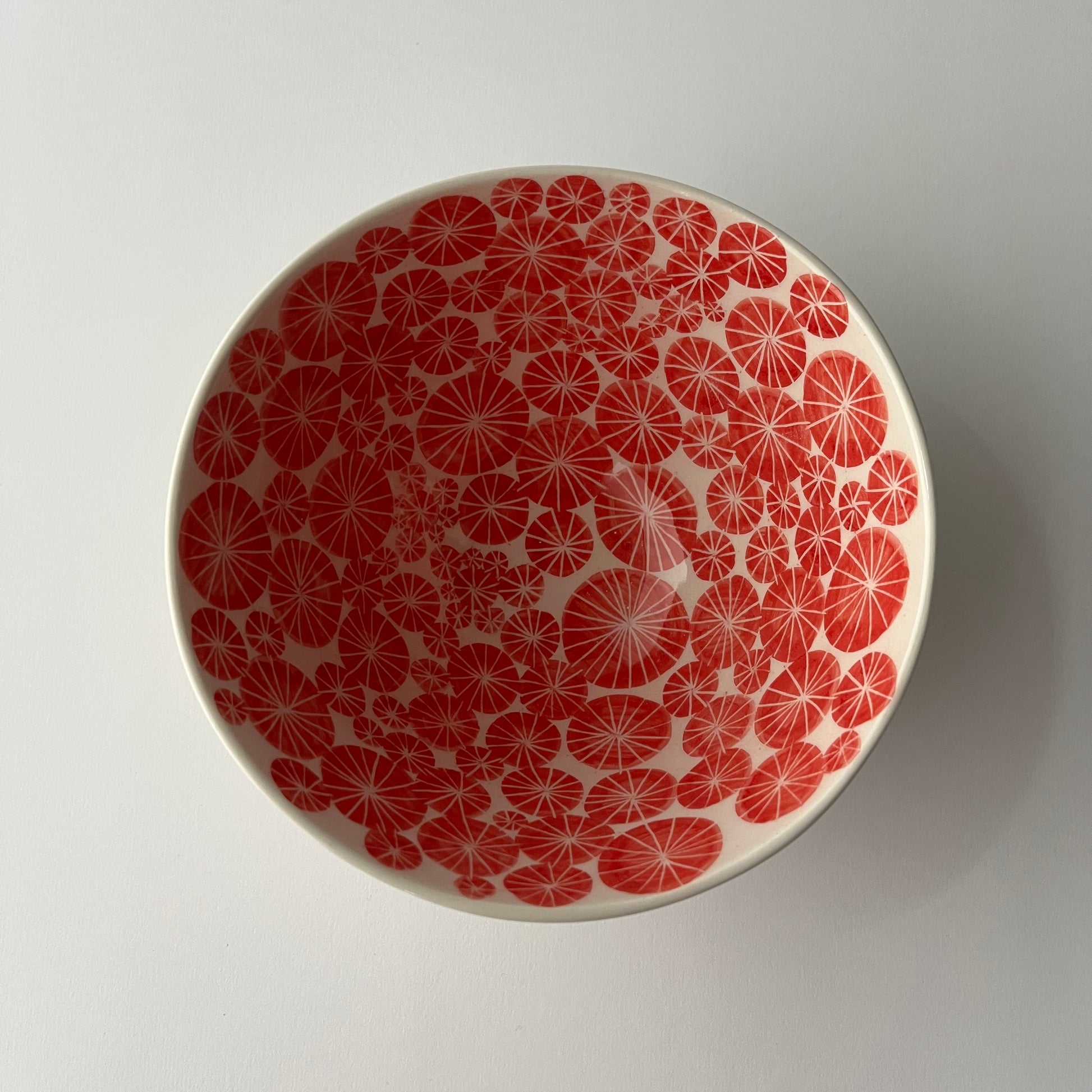 Handmade bowl crafted from white clay and decorated with underglaze pigments. The carved surface gives the bowl a lightness that makes it pleasant to hold. This bowl enlivens interiors and adds a playful touch. It can be used for food preparation, dining, or table serving.