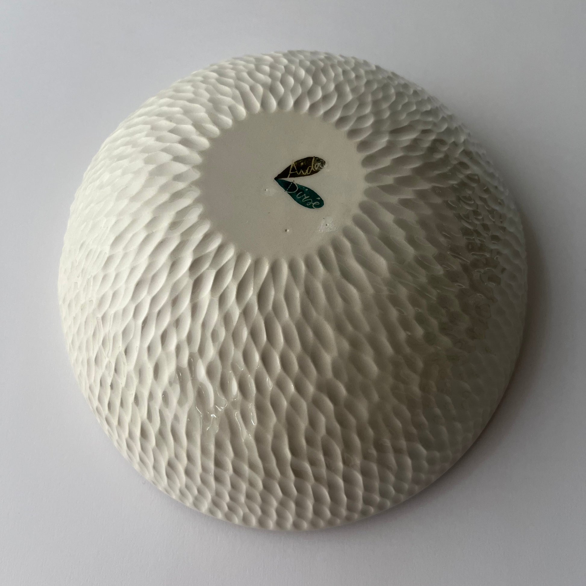 Handmade bowl crafted from white clay and decorated with underglaze pigments. The carved surface gives the bowl a lightness that makes it pleasant to hold. This bowl enlivens interiors and adds a playful touch. It can be used for food preparation, dining, or table serving.